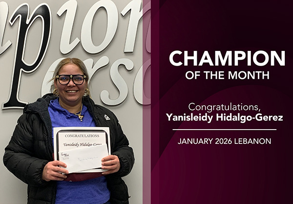 Champion Personnel honors one employee each month for being a “Champion” employee. The employees are nominated by recruiters and look for nominees who perform beyond expectations. Each Champion of the Month is recognized at their place of employment. They also receive a $25.00 Visa gift card, a certificate and a Champion Personnel t-shirt. Their picture will be displayed at our office for the month and will be shared with all of our social media followers.